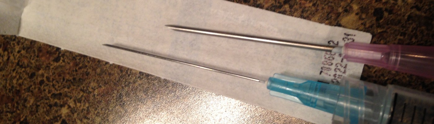 Another aside, until now, as I mentioned, I had done shots in my stomach. Shots for your stomach come in much smaller needles. When you are injecting into the muscle, the needles are obscenely larger. I knew to expect this, but expecting it is one thing, holding it up in front of your widening eyeballs, hard metal glinting in the light, waiting to plunge down into your soft flesh is an entirely different matter.